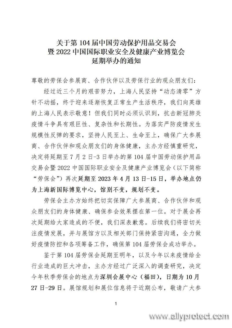 經(jīng)過近三個(gè)月的艱苦努力,上海人民堅(jiān)持“動(dòng)態(tài)清零”方針不動(dòng)搖,終于迎來逐漸恢復(fù)正常生產(chǎn)生活秩序,我們向英雄的上海人民表示敬意!但我們同時(shí)必須認(rèn)識(shí)到,抗擊新冠肺炎疫情斗爭具有艱巨性、復(fù)雜性和長期性。為落實(shí)嚴(yán)防疫情發(fā)生規(guī)模性反彈的要求,堅(jiān)持人民至上、生命至上,確保廣大參展商、合作伙伴和觀眾朋友們的身體健康,主辦方經(jīng)慎重研究,決定將延期至7月2日-3日舉辦的第104屆中國勞動(dòng)保護(hù)用品交易會(huì)暨2022中國國際職業(yè)安全及健康產(chǎn)業(yè)博覽會(huì)(以下簡稱“勞保會(huì)”)再次延期至2023年4月13日-15日,舉辦地點(diǎn)仍為上海新國際博覽中心,館別不變,規(guī)劃不變。