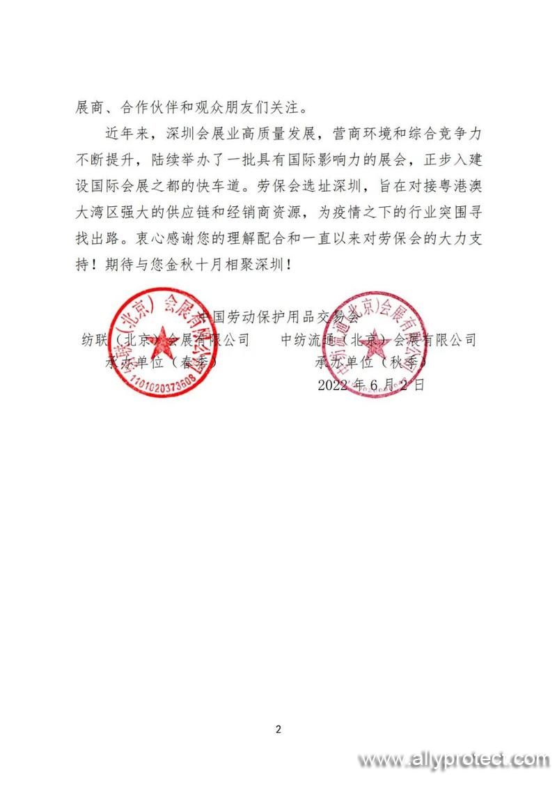 勞保會(huì)主辦方始終把切實(shí)保障廣大參展商、合作伙伴和觀眾朋友們的身體健康、確保參會(huì)效果擺在第一位。對于展會(huì)再次延期給大家造成的不便,我們深表歉意。后續(xù)我們將密切關(guān)注疫情發(fā)展,并與展館方以及相關(guān)部門保持緊密溝通,全力做好疫情防控和各項(xiàng)籌備工作,確保第104屆勞保會(huì)成功舉辦。