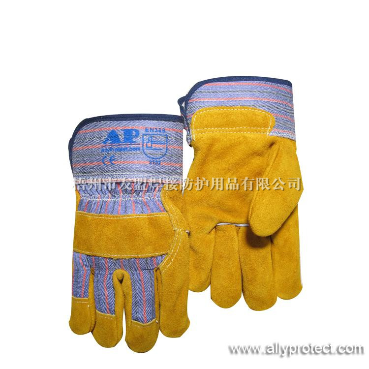 該款手套掌位部分采用耐磨、抗穿插的金黃色牛二層皮制成,質(zhì)地厚實(shí)且柔軟舒適,抗穿插及內(nèi)磨程度均勻;